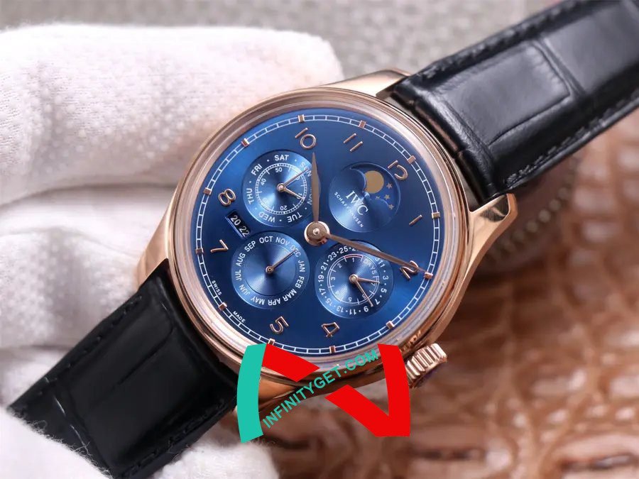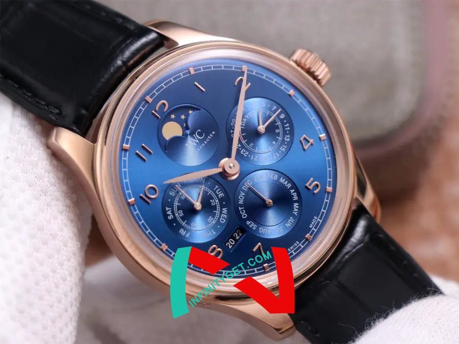 Portuguese series IW5034.01 million calendar watches, the first true permangeable calendar, the use of imported large fine work as the basis for the movement upgrade to 52610 movement, not only to achieve most of the functions and walking stability, repair rate is very low, this is the re-engraving market rarely imperficable complex function watch. Reason to start with: 1, 10,000-8-point position Perennian calendar year normal operation (2017-2024, 2024 free return to the factory to replace the year module), as the original can be adjusted by the case hide button, and better than the original reversible (original) The year is irreversible, after the adjustment is to be repaired at your own expense); 2, the sun and moon star (annual calendar) - date (3 o'clock), month (6 o'clock), week (9 o'clock) are all normal transmission operation, and can be manually adjusted (date by pulling out the second gear two-way adjustment, Month through the 8-point hidden button adjustment, the week can be driven by adjusting the pointer); 3, exquisite workmanship - both inside and outside, German CNC equipment open mold case strap, later manual one by one QC, the shell of each place of the rash and invert almost comparable to the original, movement text font distribution synchronization original, fish scales and other pattern grinding details are very delicate. The arched scratch-resistant mirror is as permeable as the original. 4, hand elegant - size 41 x 13