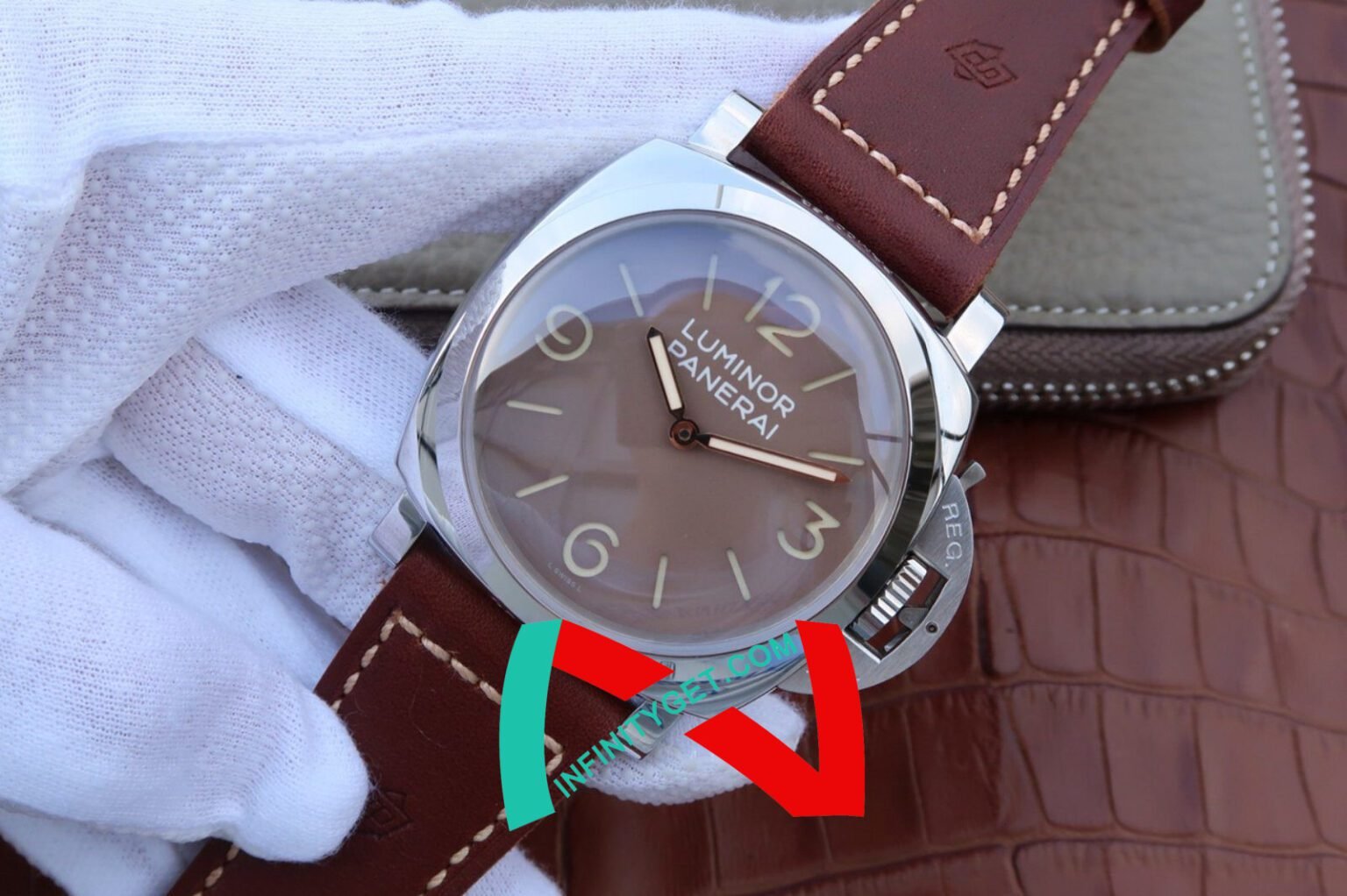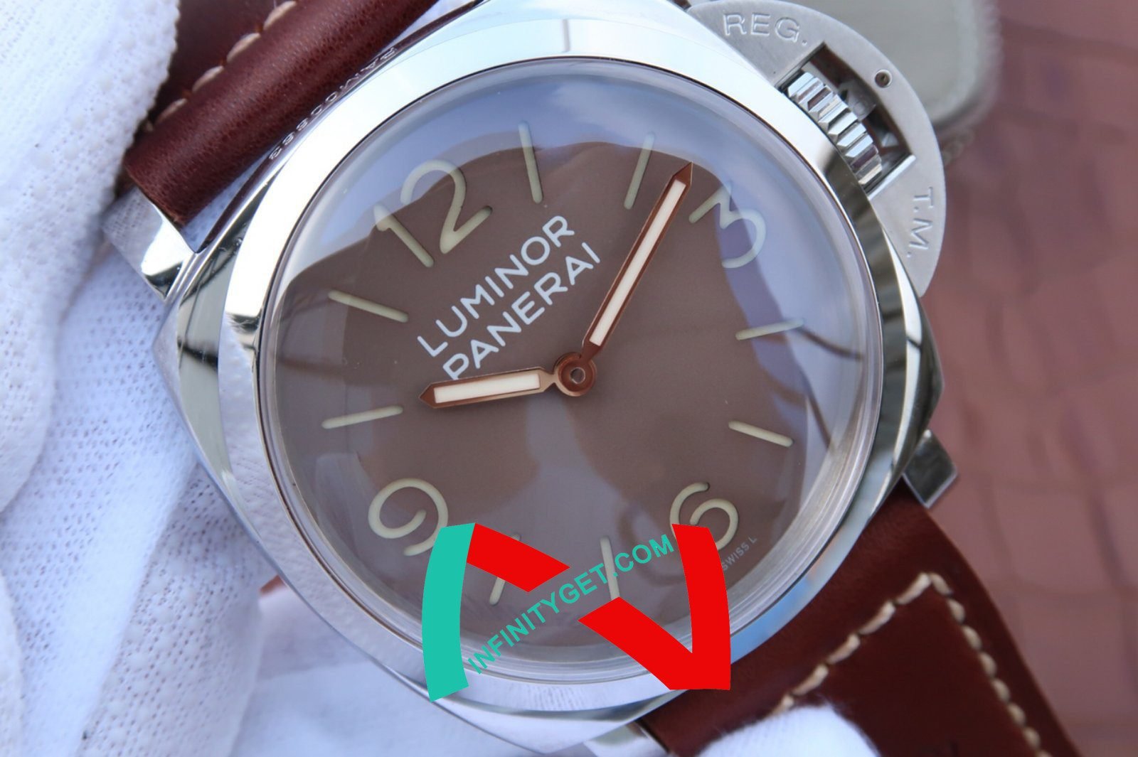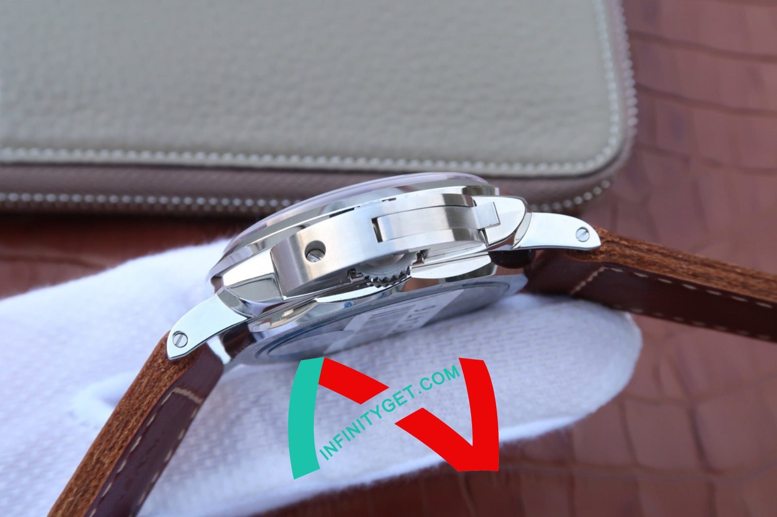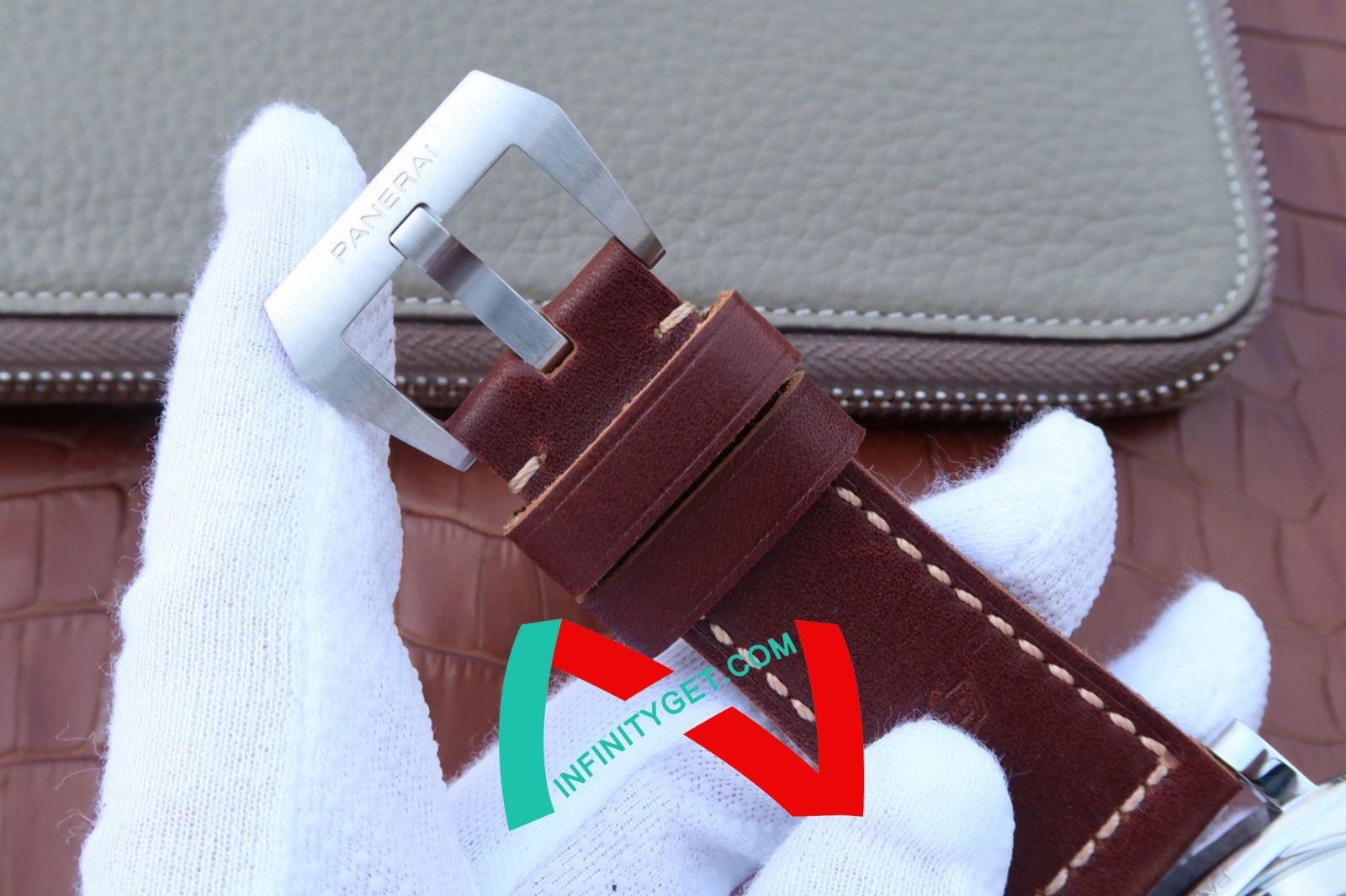 Genuine Leather Strap equipped with Stainless Steel V Buckle with Panerai Markings/Engravings. Flush Lug Screws
