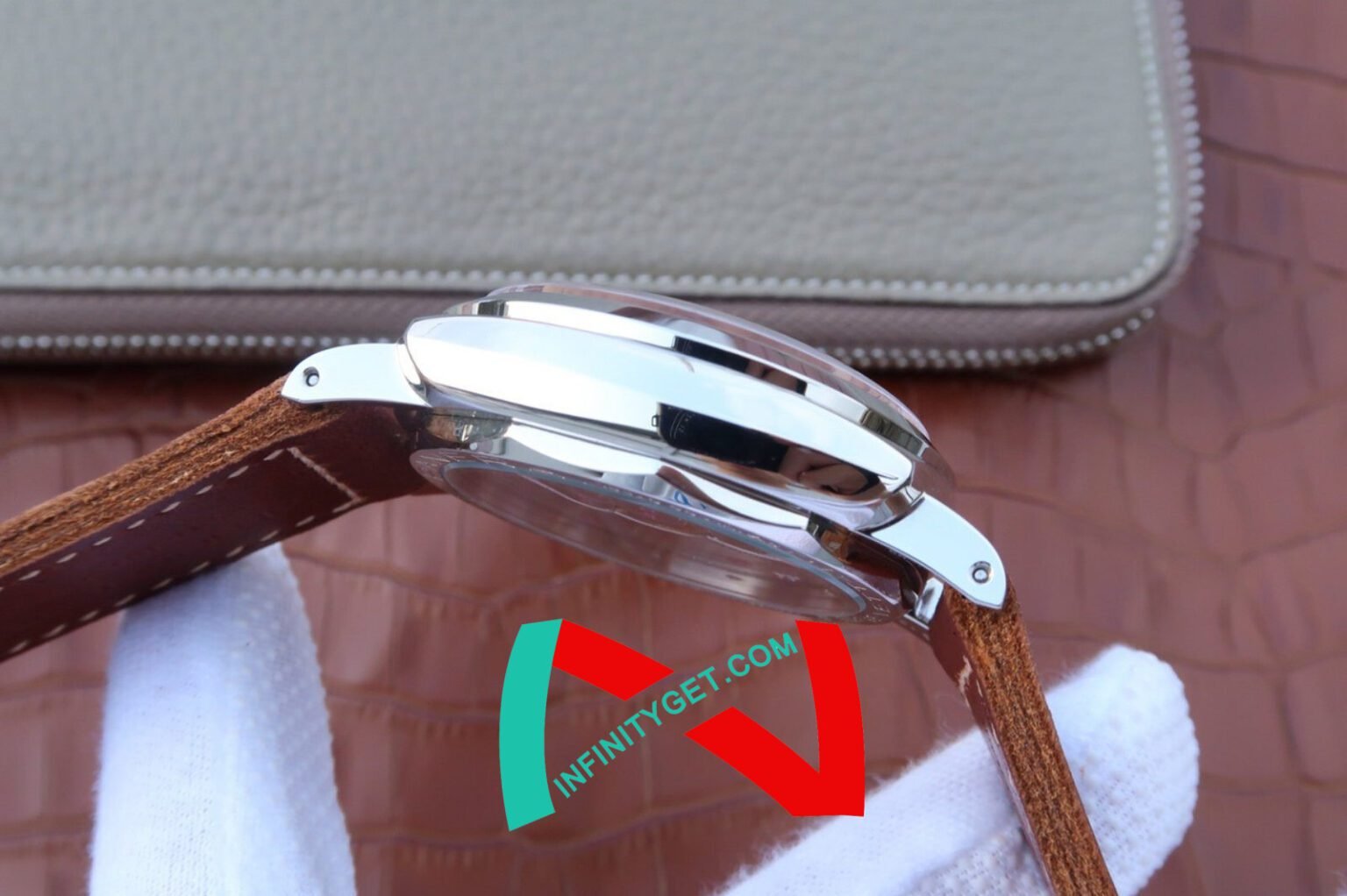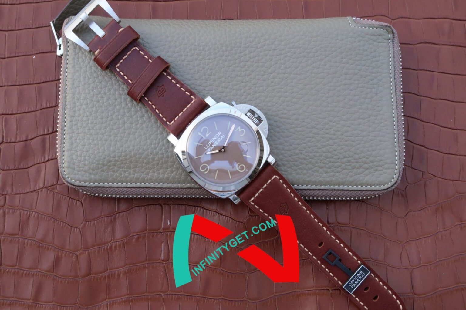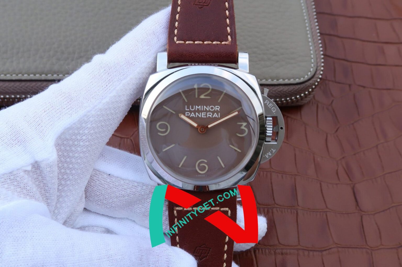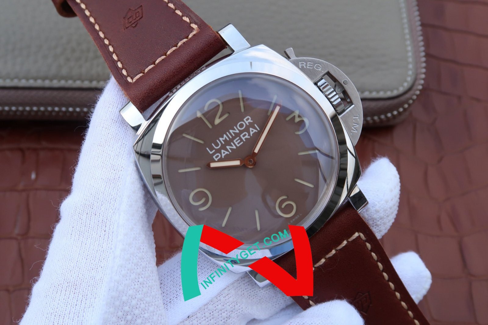 Genuine Leather Strap equipped with Stainless Steel V Buckle with Panerai Markings/Engravings. Flush Lug Screws
